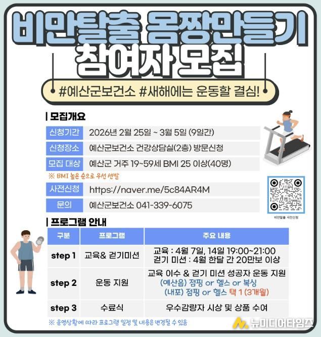 예산군보건소는 지역 주민의 비만 예방과 건강한 생활습관 형성을 위해 ‘비만탈출 몸짱만들기’ 참여자를 모집한다고 밝혔다.