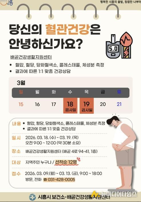 시흥시보건소 배곧건강생활지원센터는 지역 주민의 심뇌혈관질환 예방과 고지혈증(이상지질혈증) 관리를 위한 집중 교육 프로그램 ‘혈관 건강 톡톡(Talk Talk)’을 오는 3월부터 운영한다.