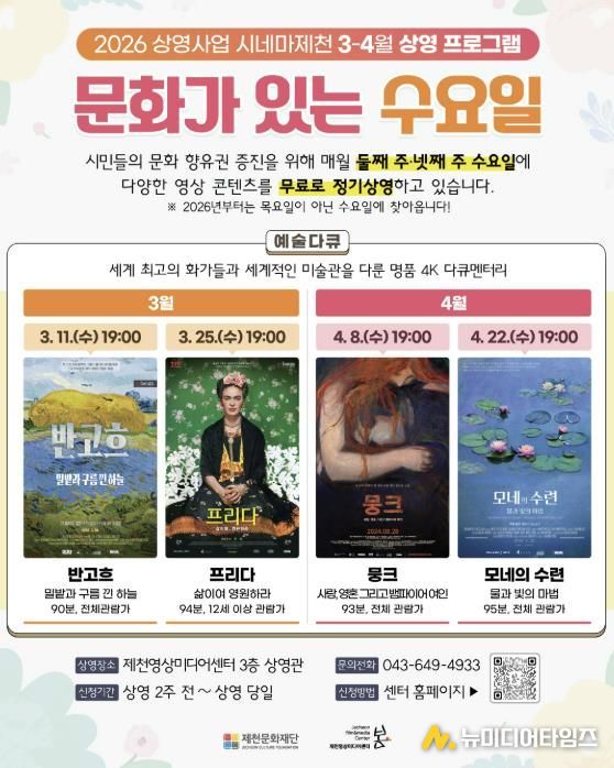제천문화재단이 오는 3월 11일부터 매월 둘째·넷째 주 수요일 오후 7시, 제천영상미디어센터 3층 상영관에서 2026년 시네마제천 '문화가 있는 수요일'을 진행한다.