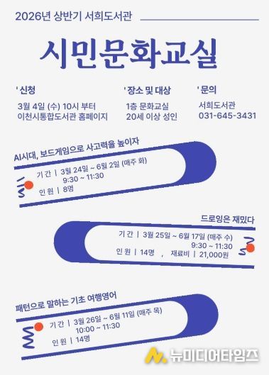 이천시 서희도서관이 지역 주민들의 문화적 소양을 높이고 배움의 즐거움을 나누기 위해 ‘2026년 상반기 시민문화교실’을 운영하고 성인 수강생을 모집한다고 밝혔다.