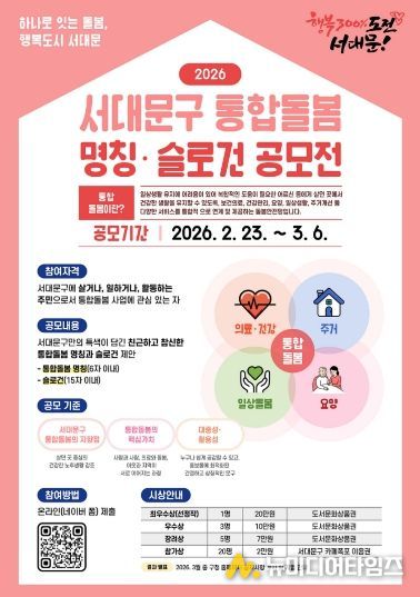 서대문구가 3월 27일 통합돌봄 제도 시행을 앞두고 서대문구만의 브랜드 정체성을 구축하기 위해 사업 명칭과 슬로건을 공모한다.