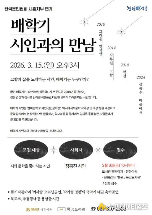 이번 만남은 3월 15일 오후 3시, 목감도서관 지하 1층 다목적실에서 진행되며, 시와 문학에 관심이 있는 50여 명의 시민과 함께한다. 시인이 직접 자신의 작품을 낭독하고, 시를 쓰게 된 계기와 창작 과정에 관한 이야기를 들려줄 예정이다. 또한, 시민들과 자유롭게 질문을 나누며 시와 삶에 대해 편안하게 대화하는 시간도 마련된다.