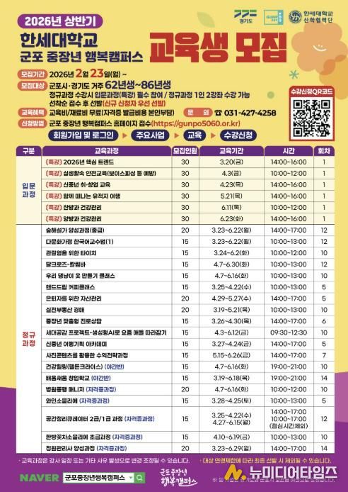군포시가 인생 2막 설계와 사회참여 확대의 기회를 제공하고자 중장년 세대를 대상으로 2026년 상반기 중장년 행복캠퍼스 교육생을 모집한다고 밝혔다.