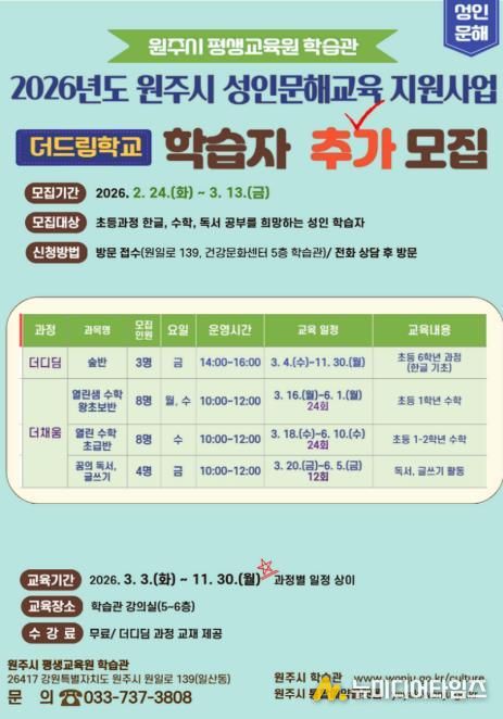 원주시 학습관은 2026년 성인문해교육 지원사업 ‘더드림(The Dream)학교’의 성인 문해 기초 과목 학습자를 추가 모집한다.