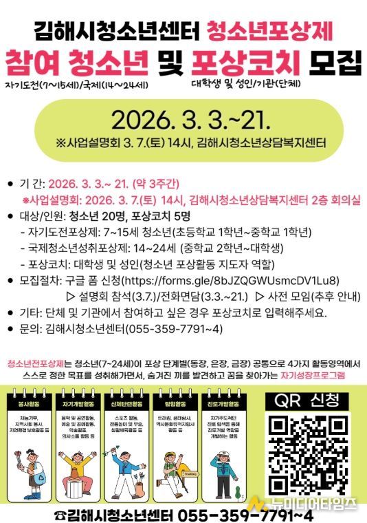 김해시청소년센터는 오는 3월 3일부터 21일까지 ‘2026년 청소년포상제’에 참여할 청소년과 이들의 활동을 지원할 포상코치를 공개 모집한다.