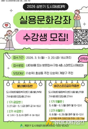 인천광역시 계양구는 오는 3월 9일부터 20일까지 ‘2026년 상반기 도시재생대학 실용·문화강좌’ 수강생을 선착순 모집한다고 밝혔다.