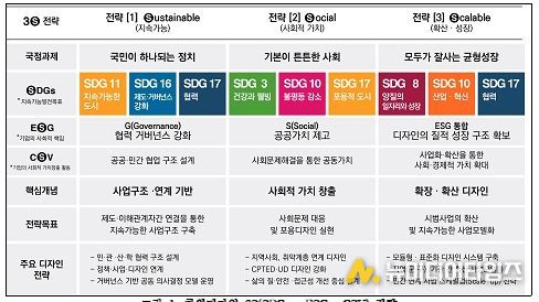 이를 위해 지속가능발전목표(SDGs), 민간협력 기반(ESG), 공유가치창출(CSV)에서 가장 중요한 ▲정책 및 제도의 지속가능성(Sustainable), ▲사회적 가치 실현(Social), ▲사업화 및 확산(Scalable)을 결합한 3S 전략을 단계적으로 구현하는 것을 핵심으로 한다.