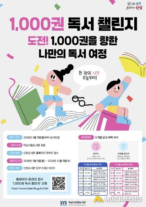 하남시신장도서관은 시민의 지속적인 독서 참여와 생활 속 읽기 습관 정착을 위해 오는 3월 9일부터 ‘1,000권 독서 챌린지’를 운영한다.