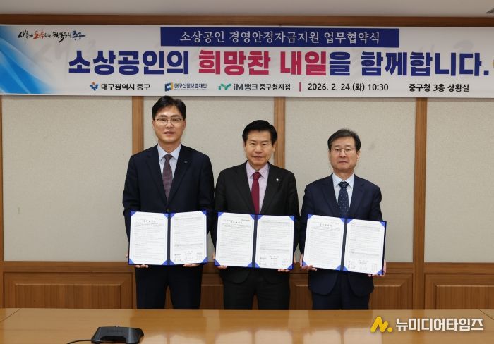 대구신용보증재단이 2월 24일 중구청 상황실에서 중구청, iM뱅크 중구청지점과 소상공인 경영안정 지원을 위한 업무협약을 체결했다.