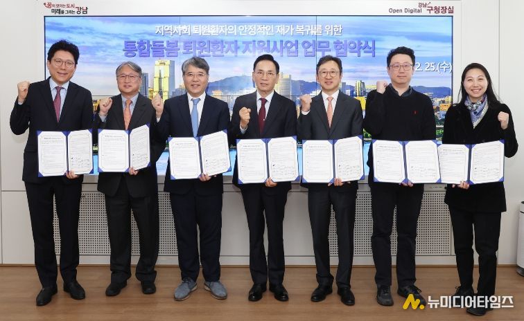 꿈이 모이는 도시, 미래를 그리는 강남구가 퇴원 이후 돌봄 공백을 줄이고 지역사회 중심의 돌봄 체계를 강화하기 위해 2월 25일 구청에서 관내 6개 의료기관과 '통합돌봄 퇴원환자 지원사업' 추진을 위한 업무협약(MOU)을 체결했다. 협약 기관은 삼성서울병원, 연세대학교의과대학 강남세브란스병원, 강남베드로병원, 나누리병원, 메드렉스병원, 강남구립행복요양병원이다.