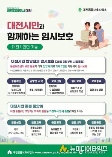 대전동물보호사업소는 보호동물의 복지 증진과 입양률 향상을 위해‘동물 보호센터 임시보호 확대 운영계획’을 마련하고 3월부터 시행한다.