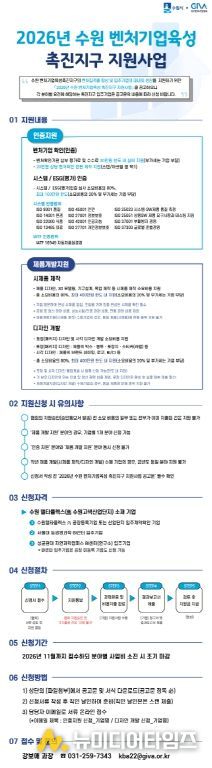 수원시 관계자는 “기술력과 성장 잠재력을 갖춘 중소·벤처기업이 한 단계 도약할 수 있도록 지원하는 사업”이라며 “벤처기업육성촉진지구 활성화 사업에 많은 기업이 참여하길 바란다”고 말했다.