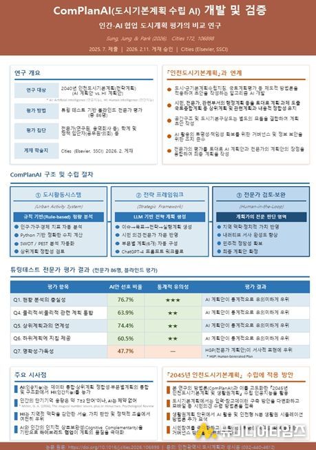 해당 방법론은 국제적으로도 이미 검증을 마쳤다. 2040년 인천도시기본계획 변경 수립 경험을 바탕으로 인공지능과 인간의 계획 특성을 비교·분석한 연구 '컴플랜에이아이를 활용한 도시계획(Planning with ComPlanAI)'은 2026년 2월 21일 사회과학인용색인(SSCI) 등재 도시계획 분야 최상위 국제학술지인 Cities(시티즈)에 게재됐다.