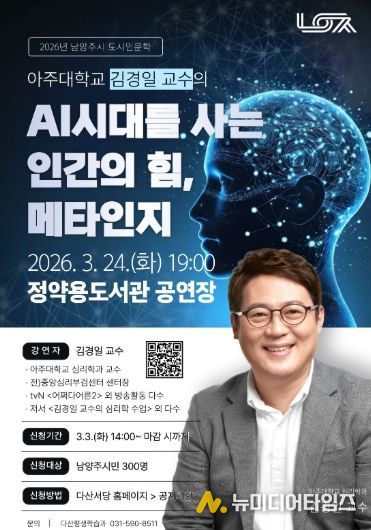 남양주시는 오는 3월 24일 정약용도서관에서 김경일 아주대학교 심리학과 교수를 초청해 ‘2026년 도시인문학 특강’을 개최한다고 26일 밝혔다.