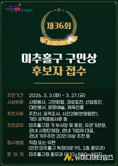 추천 서류는 미추홀구청 총무과로 직접 방문하거나 우편(미추홀구 독정이로 95, 미추홀구청 총무과)을 통해 접수할 수 있으며, 수상자는 미추홀구 구민상심의위원회의 심의를 거쳐 최종 결정된다. 시상은 5월 1일 제36회 구민의 날 기념식에서 진행될 예정이다.