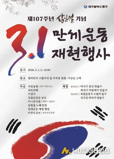 대구 중구는 제107주년 3.1절을 맞아 오는 3월 1일 오전 10시, 대구 지역 3·1 만세운동의 역사적 현장인 청라언덕과 3.1만세운동길, 이상화·서상돈 고택 일원에서 ‘3.1만세운동 재현행사’를 개최한다.