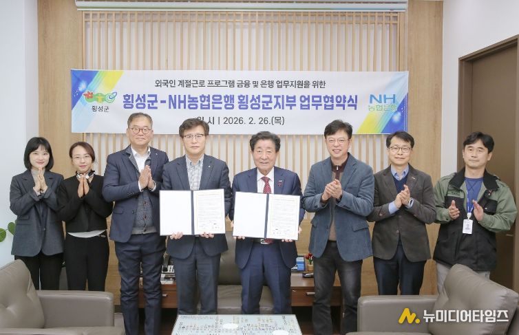 횡성군은 26일 오전 10시 군청 군수실에서 NH농협은행 횡성군지부와 ‘외국인 계절근로자 금융 및 은행 업무지원을 위한 업무협약(MOU)’을 체결했다.