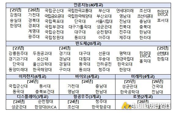 2026년에는 피지컬 인공지능(Physical AI) 시대, 중요성이 증대되고 있는 로봇 분야 2개교, 미래차 2개교를 선정했다. 또한 인공지능(AI) 분야 37개교는 지역별로 기업 수요에 기반한 인공지능(AI) 인재가 양성될 수 있도록, 비수도권 30개교(대경권 6개교, 동남권 6개교, 충청권 6개교, 호남권 6개교 및 강원·전북·제주 6개교), 수도권 7개교(서울 3개교, 경기·인천 4개교) 등 권역별로 선정했다.