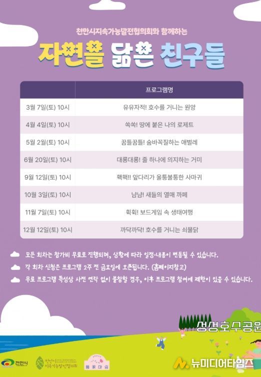두 프로그램 모두 전 회차 무료로 진행되며, 참여를 원하는 시민은 프로그램 시작 2주 전 금요일부터 천안시지속가능발전협의회 누리집을 통해 신청하면 된다.