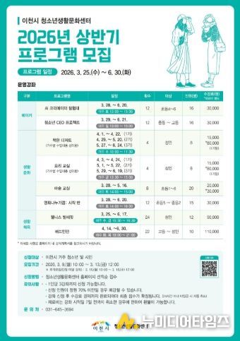이천시 청소년생활문화센터가 청소년과 지역주민의 건강한 생활문화 형성과 역량 강화를 위해 ‘2026년 상반기 프로그램’을 운영하고 수강생을 모집한다고 밝혔다.