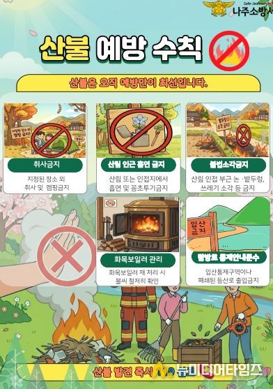 또한 나주시청, 경찰 등 유관기관과 협력하여 산불 예방 캠페인을 전개, 주민 대상으로 산불 예방 행동 요령 카드뉴스와 전단지 배부, 농부산물․쓰레기 소각 금지 산불 예방 수칙 홍보를 강화해 경각심을 높일 계획이다.