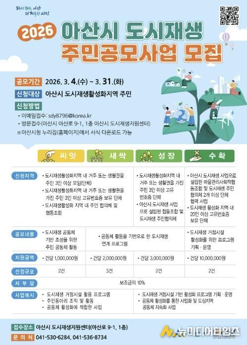 아산시는 주민 주도의 지역 활성화 기반을 확대하기 위해 '2026년 아산시 도시재생 주민공모사업' 신청을 오는 3월 4일부터 3월 31일까지 접수한다고 밝혔다.