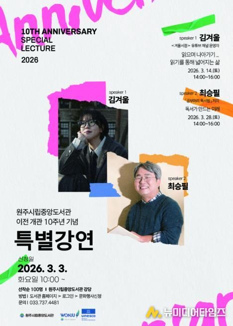 원주시립중앙도서관은 단구동 이전 개관 10주년을 맞아 시민과 함께하는 특별강연을 개최한다. 이번 강연은 독서의 가치와 삶의 확장 가능성을 주제로, 각 분야에서 활발히 활동 중인 전문가를 초청해 시민들에게 깊이 있는 인문 경험을 제공한다.