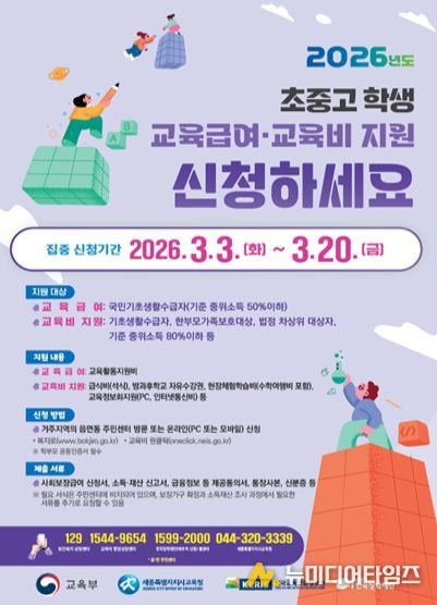 세종시교육청은 교육복지 지원 신규 대상자 발굴을 위해 2026년 3월 3일(화)부터 20일(금)까지를 집중 신청기간으로 정해 운영한다.
