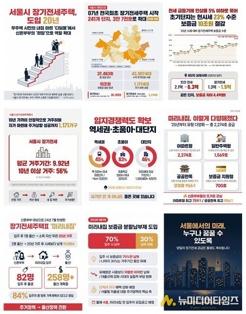 ‘장기전세주택’은 무주택 시민에게 장기간 안정적인 거주 환경을 제공하며 2007년부터 현재까지 241개 단지, 총 37,463호를 공급해 왔다. 지난 2024년에는 신혼부부에 특화된 ‘미리내집(장기전세주택Ⅱ)’을 새롭게 도입해 저출생 대응 주거정책으로 기능을 확대하고 있다. 현재 거주 중인 세대를 포함해 지금까지 총 43,907가구에 안정적인 주거를 제공했다.