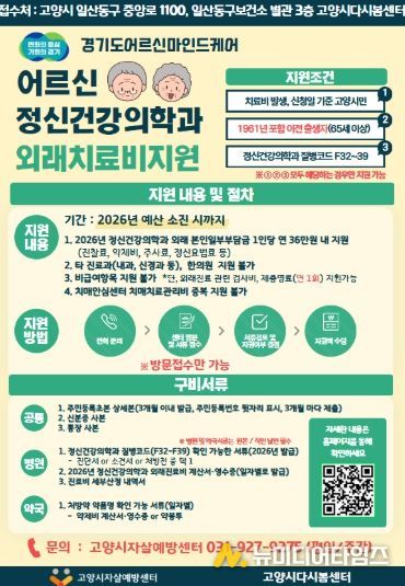 치료비 지원 대상은 고양시에 거주하는 만 65세 이상 어르신(1961년 포함 이전 출생자)으로, 정신건강의학과에서 질병코드 F32~39(우울증 및 기분장애)로 진단을 받은 경우 해당된다.