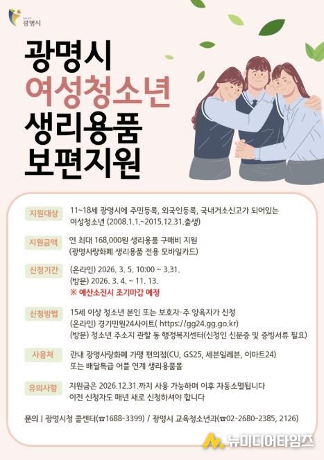 광명시가 4일부터 청소년의 건강권과 인권 보장을 위해 ‘여성청소년 생리용품 보편지원 사업’ 신청을 받는다.