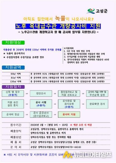 고성군은 급수관 노후로 내부가 부식되어 녹물 출수 등으로 인한 수돗물 사용에 큰 불편을 겪고 있는 세대에 옥내급수관 개량공사비를 지원한다고 밝혔다.