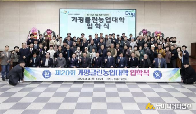 가평클린농업대학이 3일 농업기술센터 3층 대강당에서 ‘2026년 제20회 가평클린농업대학 입학식’을 열고 76명의 신입생을 맞았다. 입학식에는 농식품학과, 스마트농업과, 농촌관광과 입학생과 내빈 및 관계자 등 90여명이 참석해 새로운 출발을 축하했다.