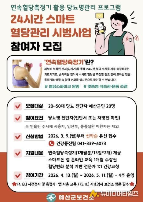 예산군보건소는 오는 3월 9일부터 ‘24시간 스마트 혈당관리 시범사업’ 참여자 20명을 선착순 모집한다.