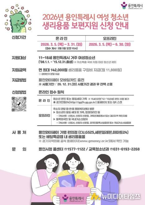 이상일 시장은 “생리용품 지원은 성장기 여성 청소년의 기본적인 건강권을 보장하고 정서적 안정감을 높여 보다 건강한 성장을 돕는 기반이 될 것”이라며 “청소년뿐 아니라 노인, 장애인 등 110만 용인 시민이 피부로 느낄 수 있는 생활밀착형 복지 정책을 지속적으로 추진하겠다”고 했다.