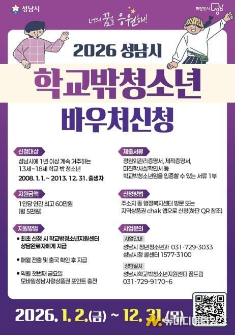 성남시 관계자는 “학교 밖 청소년 바우처 사업은 단순한 금전 지원이 아닌 청소년이 자신의 삶을 주도적으로 설계할 수 있도록 돕는 성장 지원 정책이자 성남시 적극 행정의 하나”라면서 “은둔·고립 위기 청소년 발굴과 사회 복귀 지원책을 지속해 나갈 것”이라고 말했다.