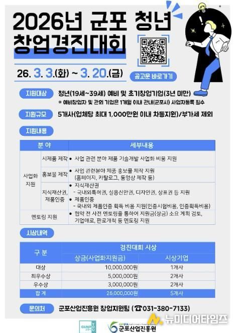 군포산업진흥원은 지역 내 유망 청년 창업가를 발굴하고 혁신 아이디어의 성공적인 사업화를 지원하기 위해 2026년 군포 청년 창업경진대회 지원사업 참가자를 2026년 3월 3일부터 3월 20일까지 모집한다고 밝혔다.