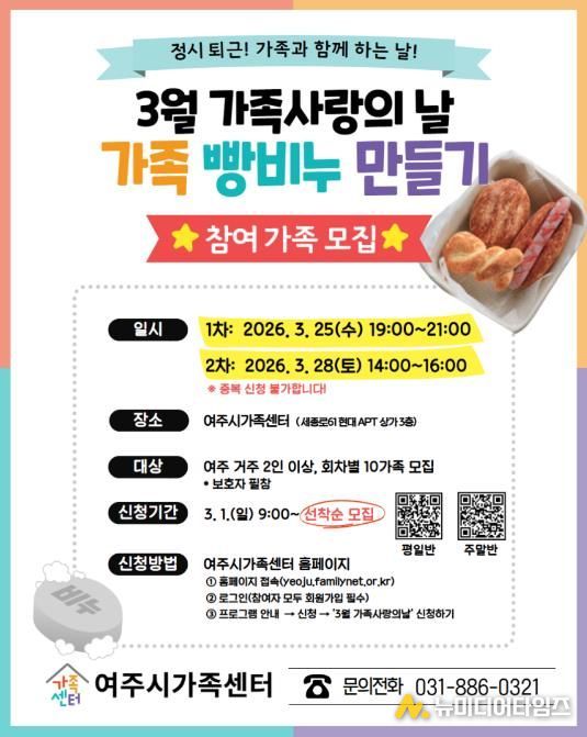 “가족사랑의 날”은 여주시 거주 가족을 대상으로 3월부터 11월까지 매월 2회기씩 운영된다. ▲ 3월: 가족 빵비누 만들기 ▲ 4월: 미니 도넛 만들기 ▲ 5월: 나들이 도시락 만들기 ▲ 6월: 공간 향수 만들기 등 온 가족이 함께 즐길 수 있는 체험형 활동으로 구성된다. 특히 4월5월8월에는 센터 방문이 어려운 원거리 거주 가족을 위해 ‘찾아가는 가족사랑의날’을 병행하여 운영의 폭을 넓혔다. 참여 신청은 매월 1일부터 여주시가족센터 홈페이지를 통해 선착순으로 모집한다.