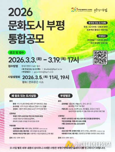 부평구문화재단은 오는 19일까지 ‘2026년 문화도시부평 통합공모’ 참여자를 모집한다고 밝혔다.