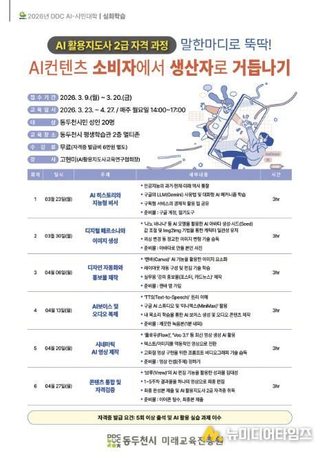 동두천시는 다가오는 인공지능(AI) 시대에 발맞춰 시민들의 디지털 미래 역량을 강화하기 위해 ‘2026년 DDC AI-시민대학’을 개최하고, 오는 3월 9일부터 수강생을 모집한다고 밝혔다.