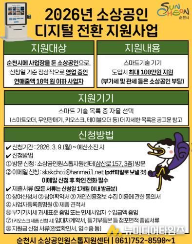 순천시는 온라인 주문 확대와 비대면 소비 증가 등 디지털 환경 변화에 대응해 지역 소상공인의 경쟁력을 높이기 위한 ‘2026년 소상공인 디지털 전환 지원사업’을 본격 추진한다.