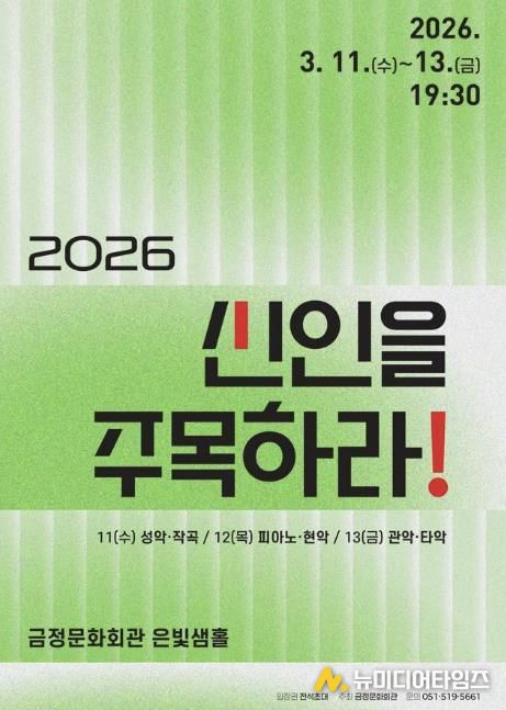 부산 금정구 금정문화회관은 3월 11일부터 13일까지 은빛샘홀에서 젊은 연주가 육성 시리즈인 '2026 신인을 주목하라!’를 개최한다.