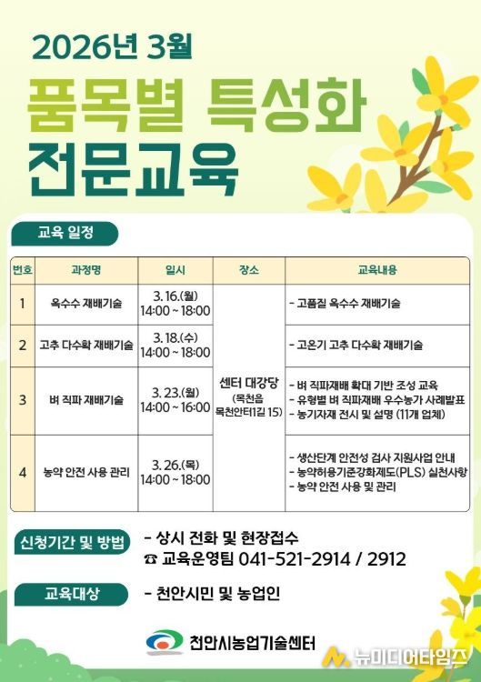 천안시농업기술센터는 본격적인 영농철을 앞두고 ‘품목별 특성화 전문교육’을 운영한다고 6일 밝혔다.