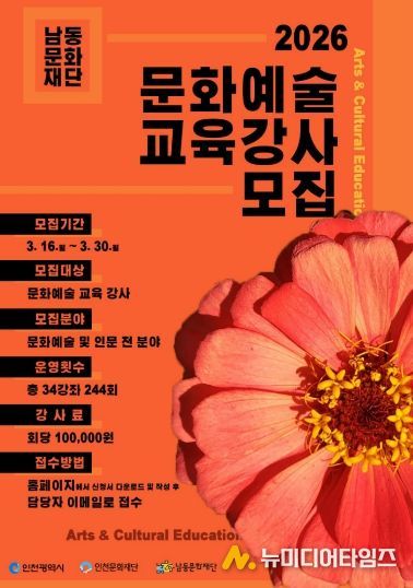 인천문화재단과 남동문화재단이 ‘2026년 문화예술 교육 사업’ 추진을 위한 문화예술 교육 강사를 공개 모집한다.