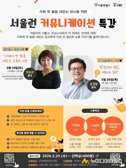 서울시가 새로운 환경에 첫발을 내딛는 대학생과 사회 초년생들이 사회 적응 과정에서 겪는 소통의 어려움을 완화하고, 건강한 커뮤니케이션 역량을 높이기 위해 소통 전문가 이호선·김경일 교수와 함께 ‘서울런 커뮤니케이션 특강’을 개최한다.