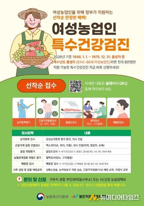 검진은 수원시 권선구에 위치한 수원덕산병원에서 진행되며, 근골격계 질환, 심혈관계 질환, 골절·낙상 위험, 농약 노출 관련 검사, 폐기능 검사 등 농작업 환경과 관련된 건강검진 항목으로 구성됐다. 또한 전문의 상담과 예방교육도 함께 제공된다.