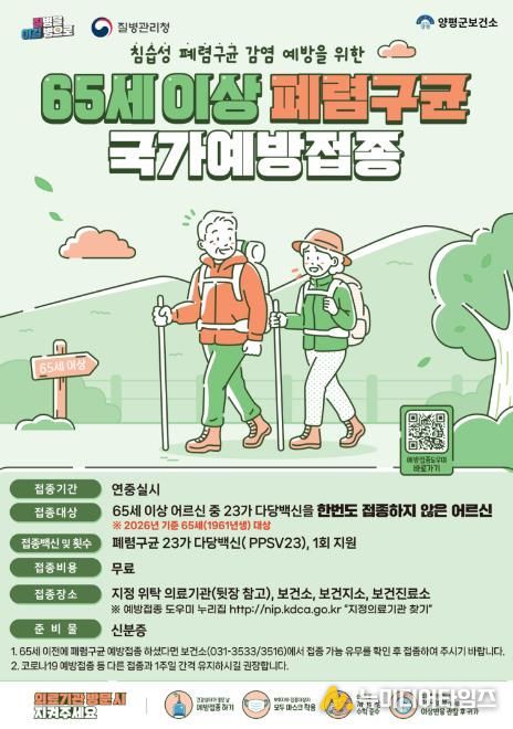 전진선 양평군수는 “양평군은 어르신들의 건강한 노후를 위해 폐렴구균 무료 예방접종을 연중 지원하고 있다”며 “1회 접종만으로도 예방 효과가 큰 만큼 많은 어르신이 접종에 참여해 건강하고 활기찬 노후를 보내시길 바란다”고 말했다.