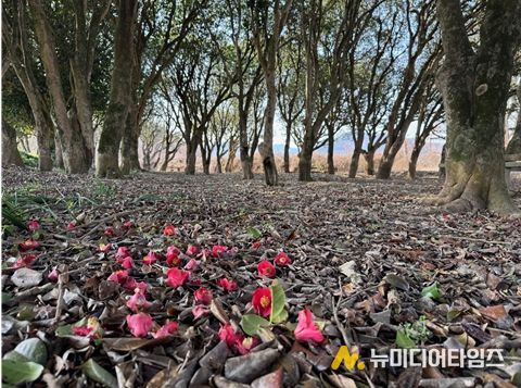 장흥군 묵촌마을에 조성된 동백림에 동백꽃이 만개했다.