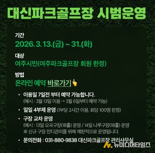 임명진 사장은 “대신파크골프장은 시민의 건강과 행복을 가꾸는 여주시의 소중한 자산”이라며, “신규 조성된 천연잔디가 최상의 컨디션을 갖출 수 있도록 4부제 및 구장 교차 운영을 결정하게 된 점 시민 여러분의 깊은 양해를 부탁드린다”고 밝혔다. 이어 “명품 구장은 관리자와 이용자가 함께 만들어가는 것인 만큼, 성숙한 이용 에티켓을 통해 대신파크골프장이 전국 최고의 명소로 거듭날 수 있도록 힘을 모아달라”고 당부했다.