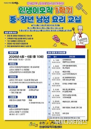 순천시는 중·장년 남성의 건강한 식생활 형성과 활기찬 인생 2막 준비를 지원하기 위해 ‘중·장년 남성 요리교실’ 수강생을 모집한다고 밝혔다.